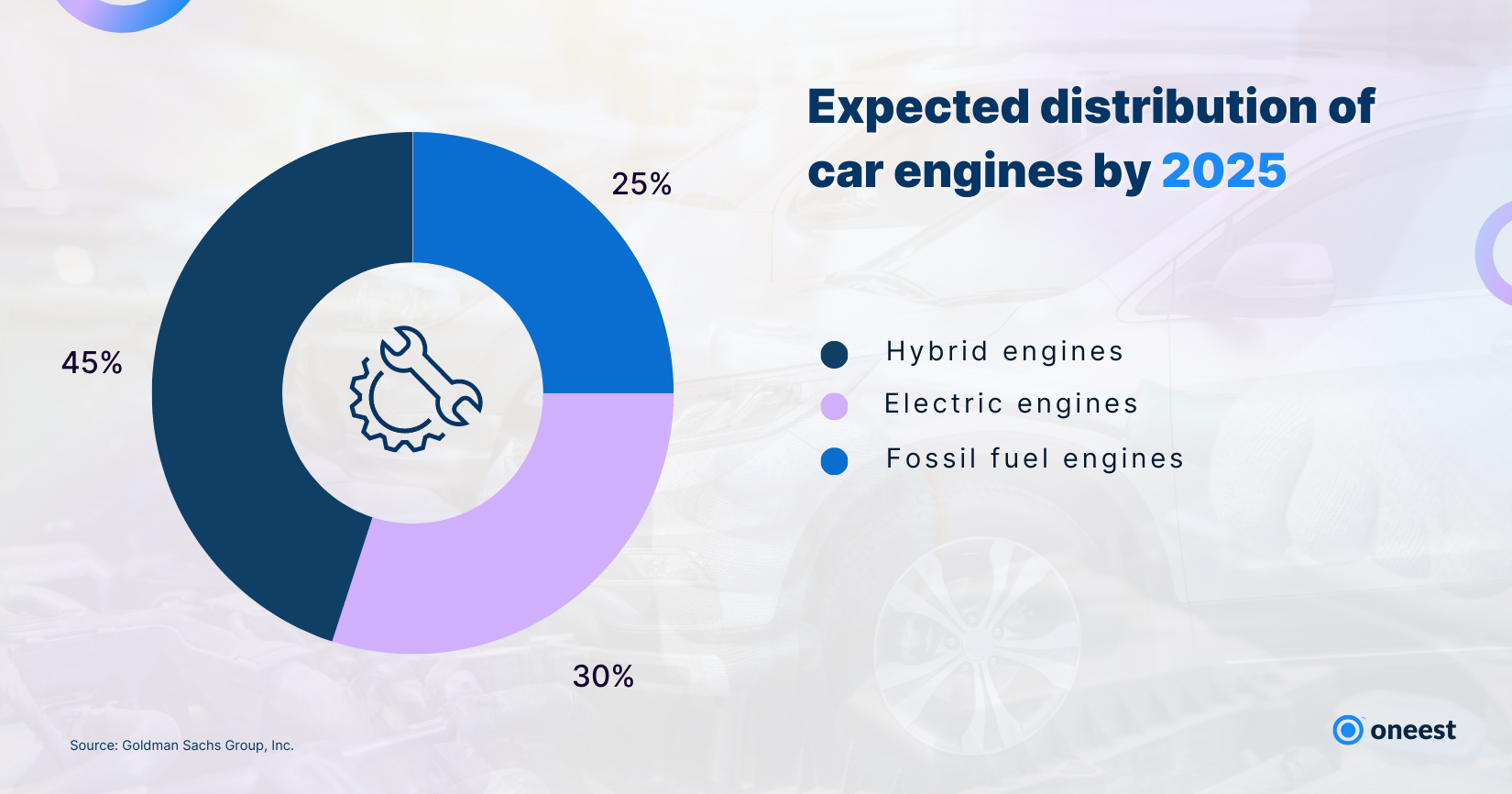 By 2025, 25% of cars sold will have electric engines. Most of those cars will be hybrids, and the majority (95% of cars) will still use fossil fuels for at least part of their power. Because of the decrease in the amount of fossil fuel, automakers will need to make internal combustion engines more efficient in order to meet new standards.