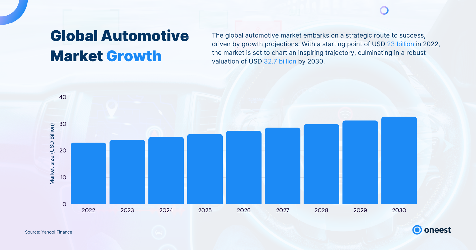 As per Yahoo finances, the automotive market is expected to grow to USD 28.7 billion by 2030. The global big data market in the automotive industry was valued at USD 4,500 million in 2021. By 2030, it is estimated to reach 15,800 million.